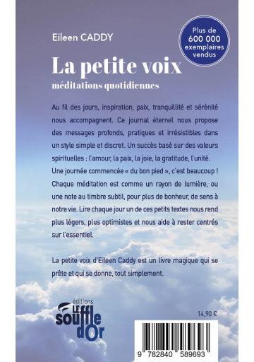 Au fil des jours, inspiration, paix, tranquillité et sérénité nous accompagnent. Ce journal éternel nous propose des messages profonds, pratiques et irrésistibles dans un style simple et discret. Un succès basé sur des valeurs spirituelles : l’amour, la paix, la joie, la gratitude, l’unité. Une journée commencée « du bon pied », c’est beaucoup ! Chaque méditation est comme un rayon de lumière, ou une note au timbre subtil, pour plus de bonheur, de sens à notre vie. Lire chaque jour un de ces petits textes nous rend plus légers, plus optimistes et nous aide à rester centrés sur l’essentiel. La petite voix d’Eileen Caddy est un livre magique qui se prête et qui se donne, tout simplement.